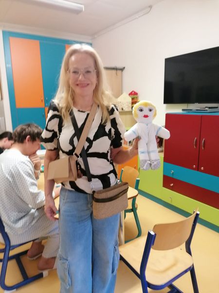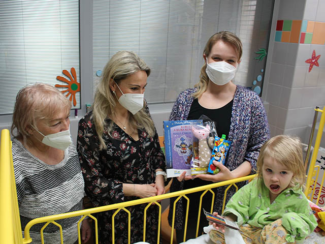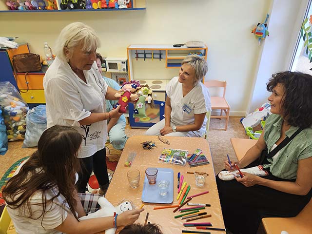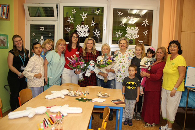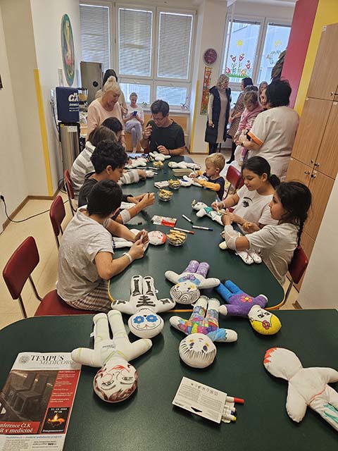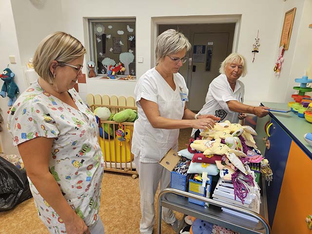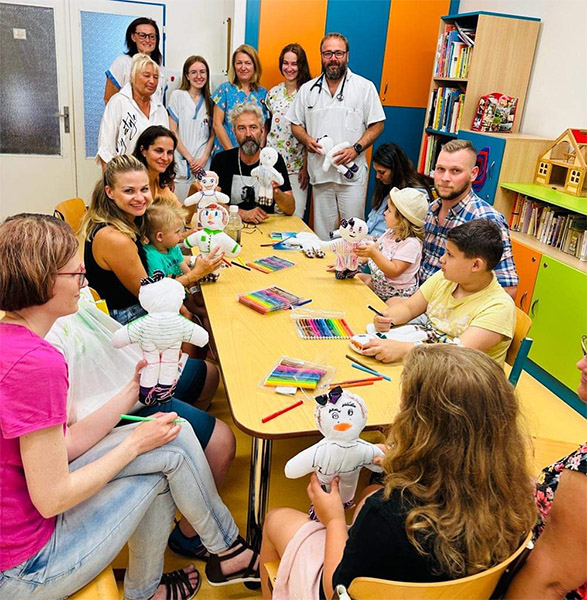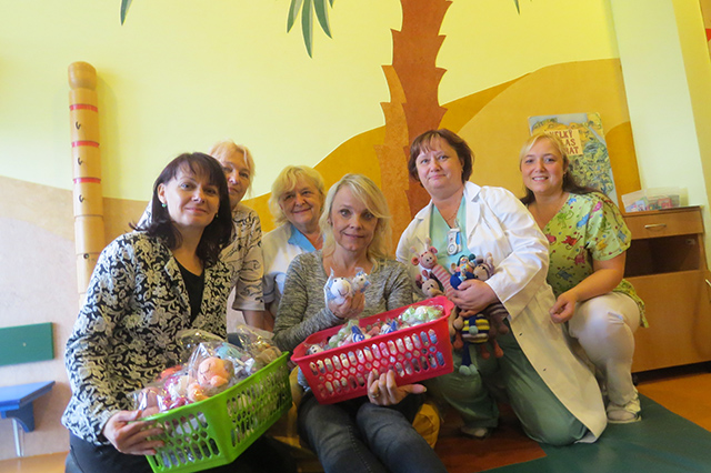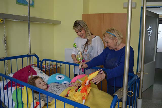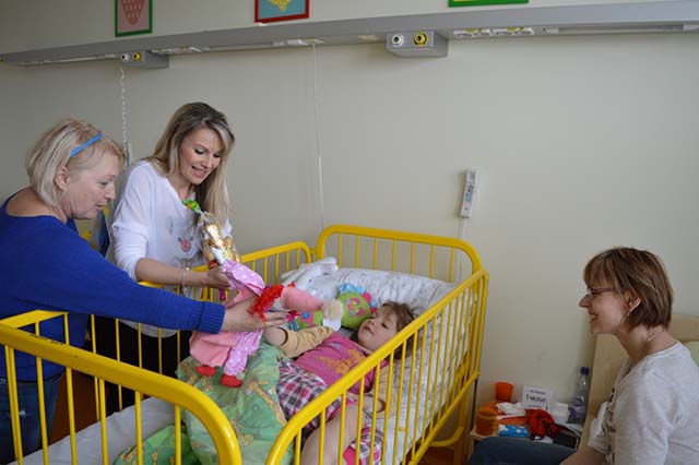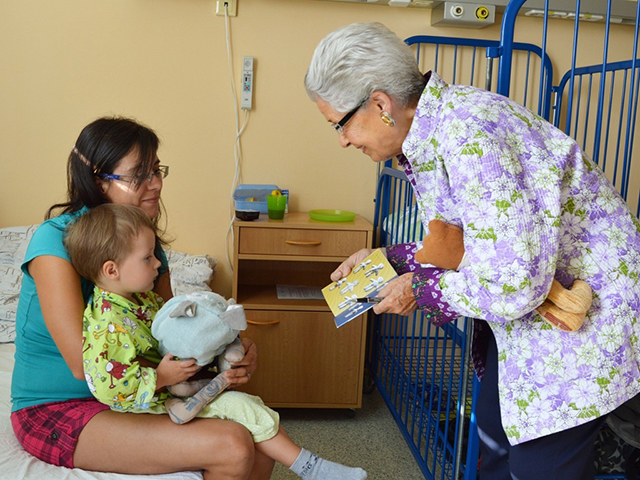 Prezidentka sdružení Eva Pastušková rozdává osobně společně s významnými hosty na dětských odděleních nemocnic v moravskoslezském kraji dětem různé dary a bílé látkové panenky, které si mohou podle sebe samy vymalovat.