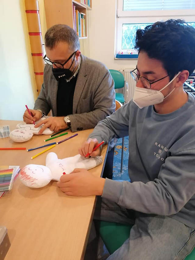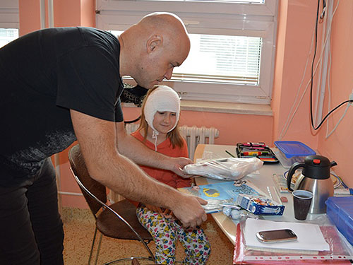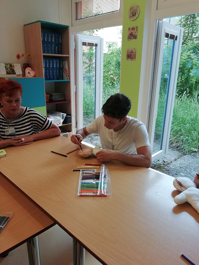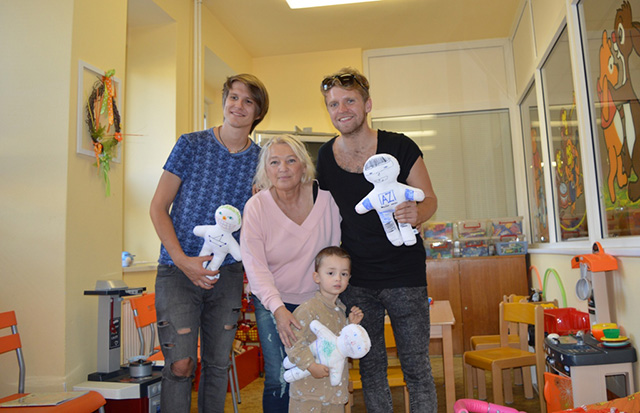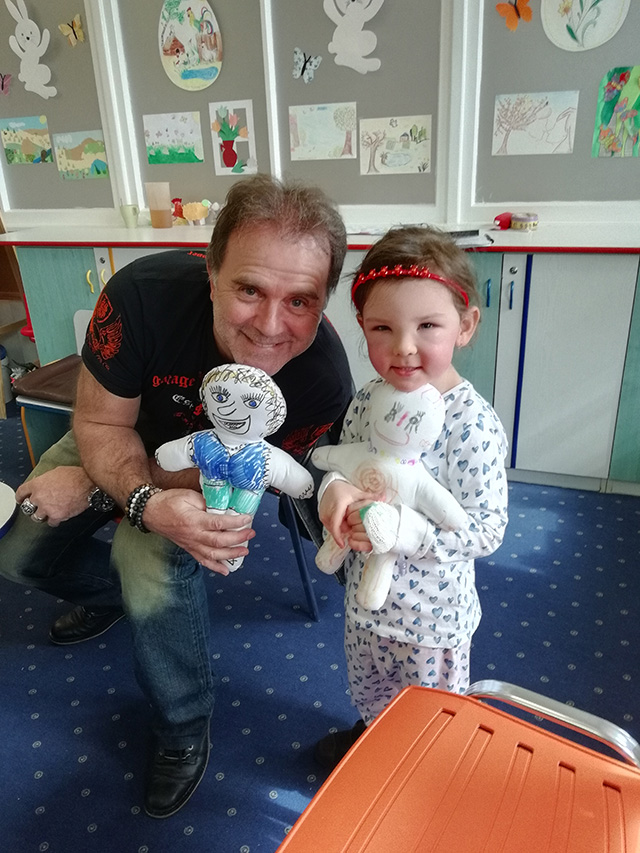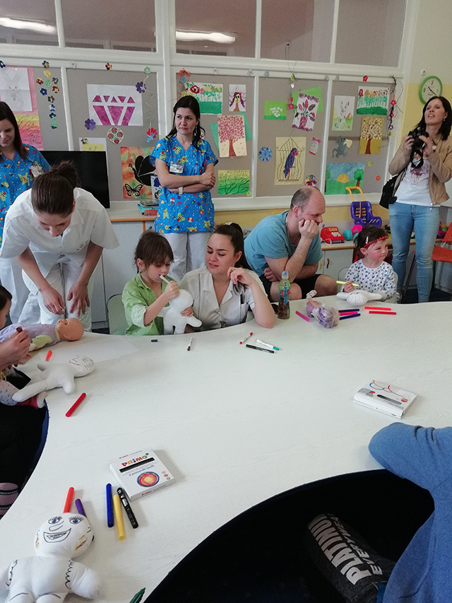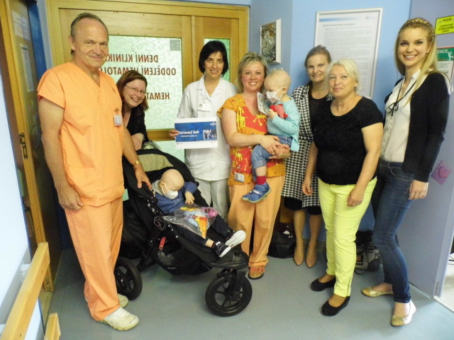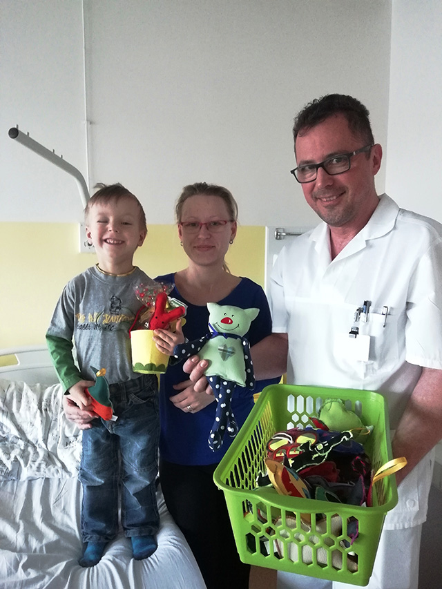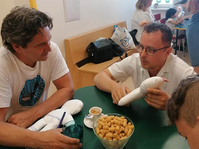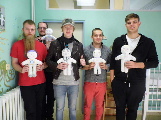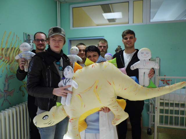 Malí i větší mladí pacienti malovali s Mirkem a Naďou naše látkové panenky, které dětem slouží jako jejich noví kamarádi během pobytu v nemocnici. Na závěr nechyběla i odměna za namalované panenky. Děti dostaly balíček sladkosti, látkového hajánka a malé lego. Zajímavé bylo i veselé povídání z Miroslavem Etzlerem a panem primářem, kteří během návštěvy zjistili, že vlastně chodili na stejné gymnázium. Mirek s humorem jemu vlastním panu primářovi gratuloval k úspěchům ve své odborné praxi, že se očividně mnohem lépe na gymnásiu učil :).