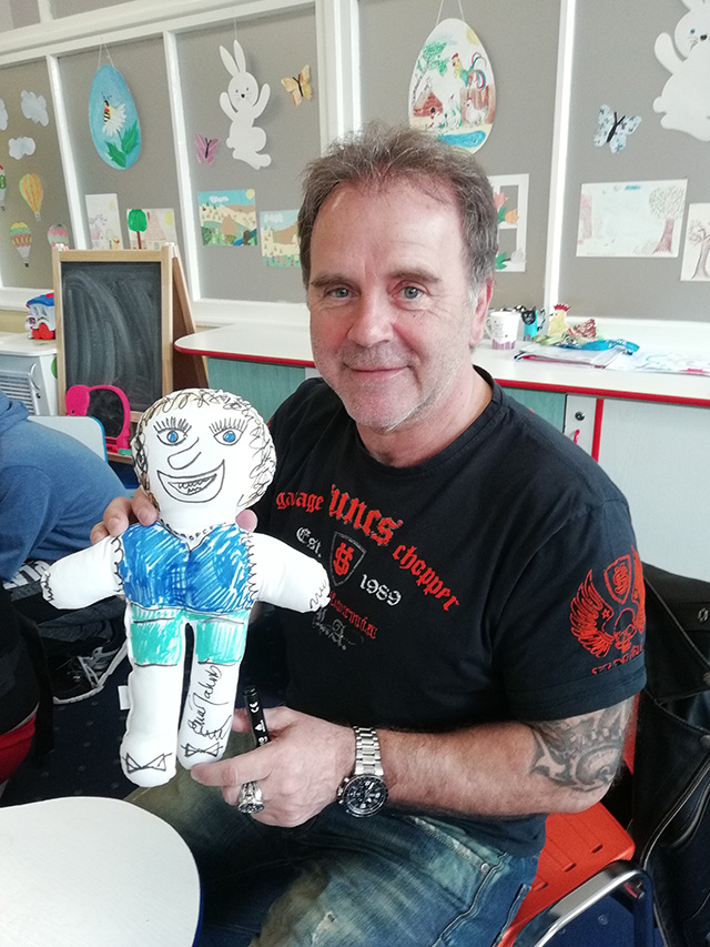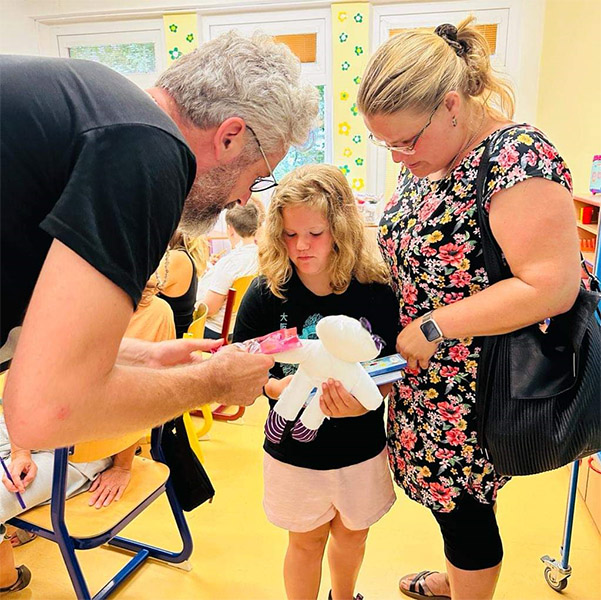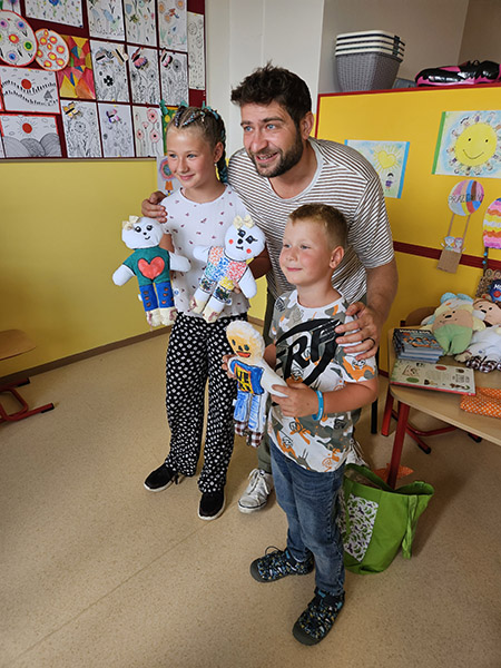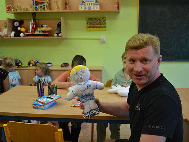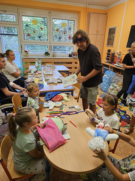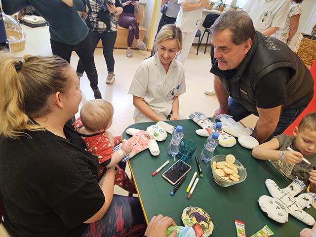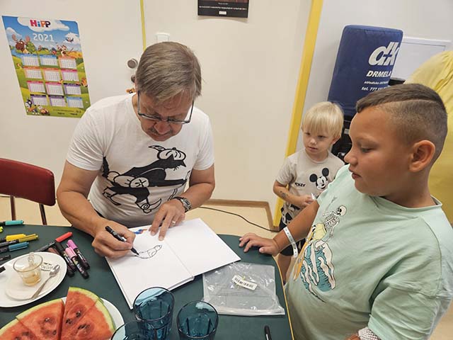 1.7.2023 Roman Zach rozdával a kreslil panenky na dětském oddělení v nemocnici Havířov...
