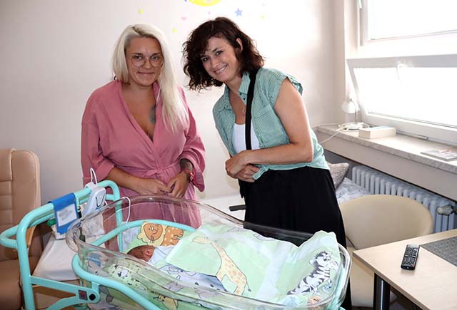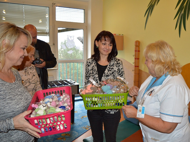 Následovala návštěva gynekologicko-porodního oddělení, které je nově otevřené po celkové rekonstrukci. Pro toto oddělení připravila organizace "Panenka dětem" nové postavičky z vazební věznice Ostrava a háčkované postavičky od žen z věznice Opava. Tyto postavičky jsou novým produktem našeho sdružení a slouží jako trvalý dárek pro novorozence a jejich rodiče. Míša Badinková navštívila čerstvé maminky i tatínky na pokojích, kterým přinesla veselou látkovou postavičku, sladkou odměnu a své povzbuzující slova.