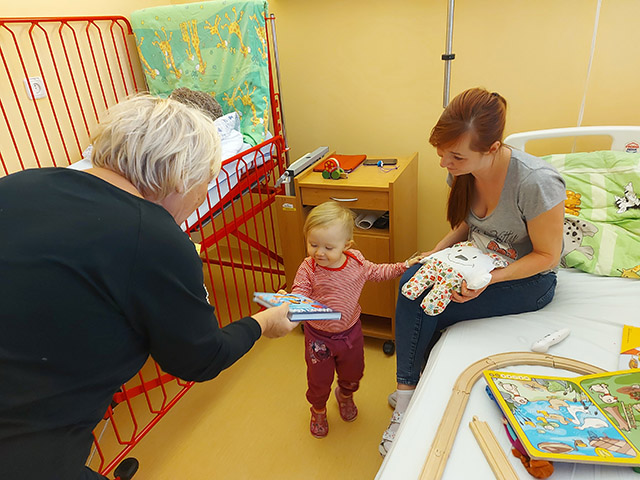Poté následovala návštěva pokojů dětského i porodního oddělení, kde rozdávala dárky i s věnováním, všem pacientům na oddělení. Kromě knížek, strašidýlek, sladkostí i jiných drobností přidávala i svůj upřímný zájem o každého jednotlivce. Bohužel některé pokoje s ohledem na zdravotní stav pacientů byly pouze přez okénko.