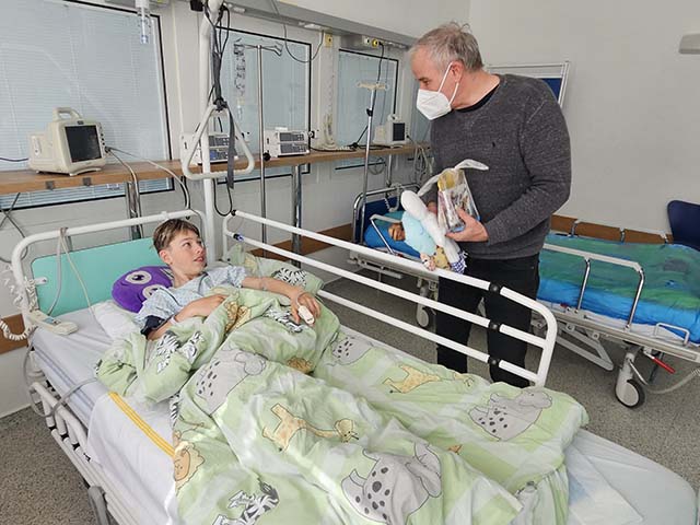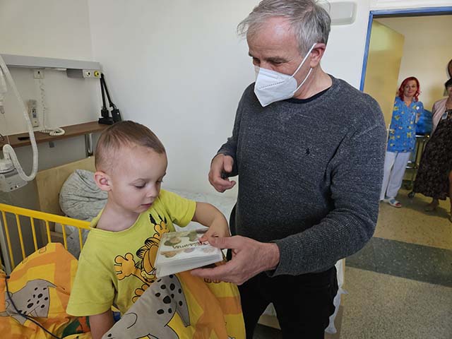 Na závěr jsme ještě roznesli dárky dětem na pokoje a na jednotku intenzivní péče. Tyto děti nemohly přijít za náma na hernu. Velice děkujeme Vladimírovi, že si našel ve svém nabitém programu čas na děti.